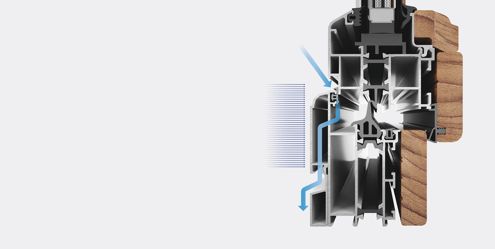 鋁材表面因為內外溫差和空氣中的水汽,容易在室內側鋁材表面產生冷凝水。3mm冷凝水通道,避免木材長期和水接觸,使木材不易霉變、腐爛。
